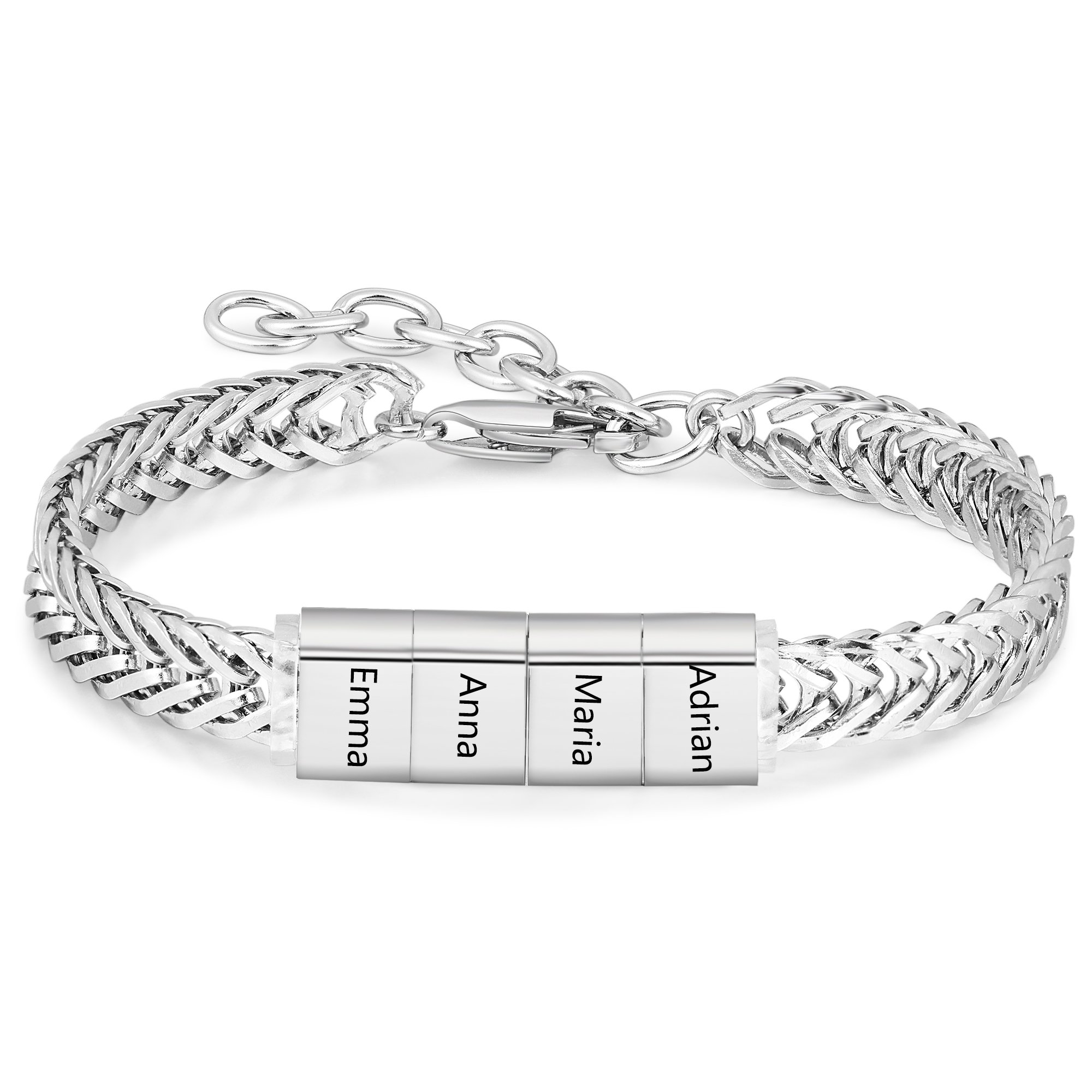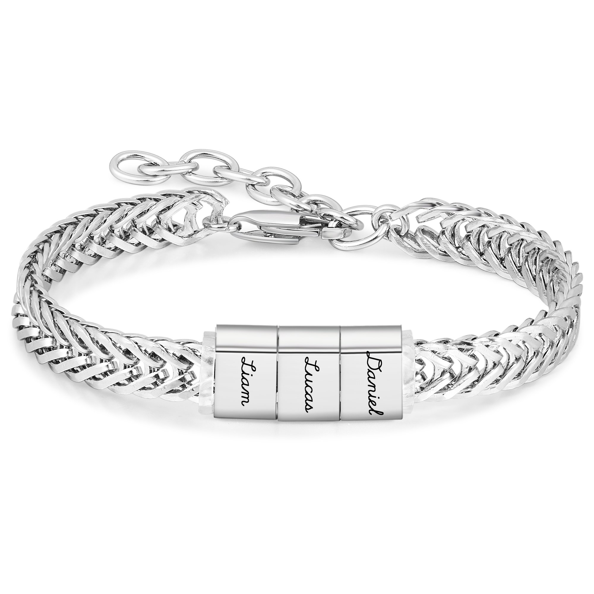 Personalize this robust bracelet with up to five customizable charms, perfect for engraving meaningful names, dates, or a special message. Crafted in a timeless silver finish, it features a durable curb chain that’s made to last. With its tarnish-resistant materials, he can wear it for any daily activity—from showering to sports—without losing its shine. This bracelet includes a 7-inch chain with a 2-inch extension (18cm + 5cm) for a flexible, comfortable fit, and with three unique font options, you can truly personalize it to suit his style.