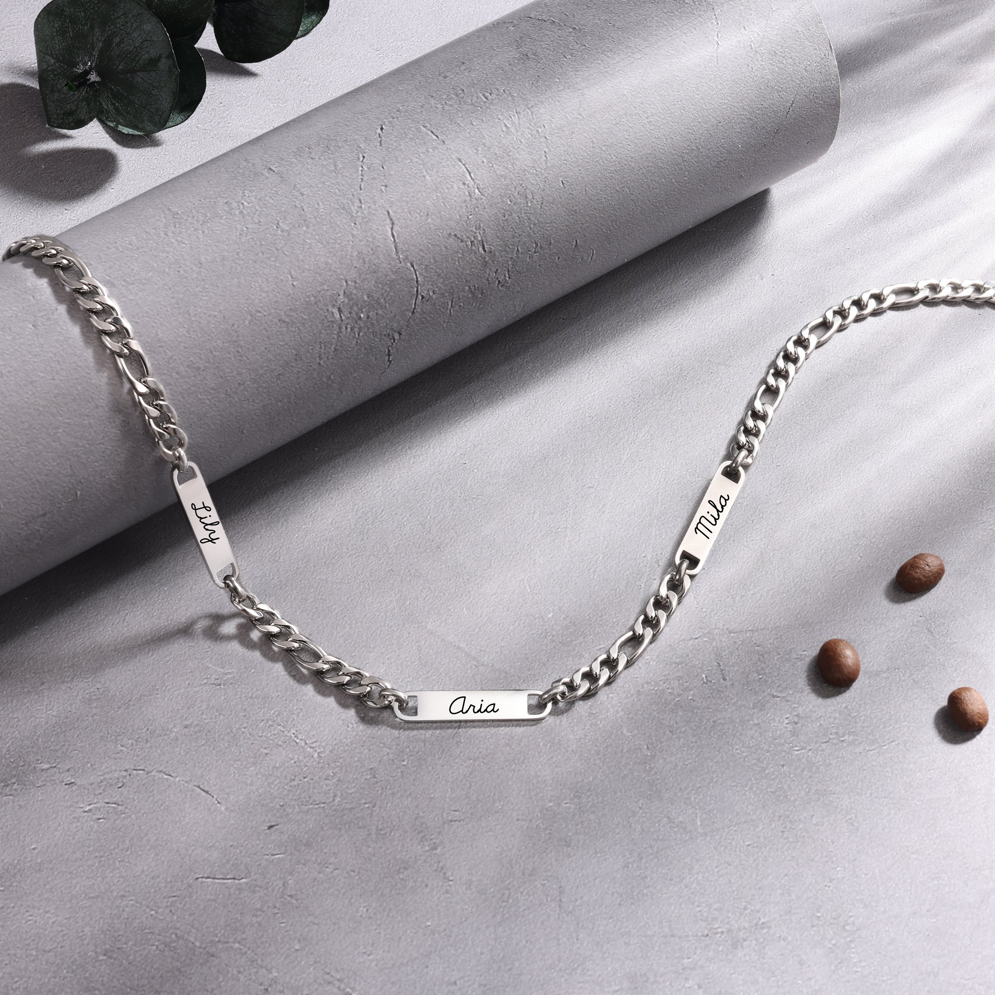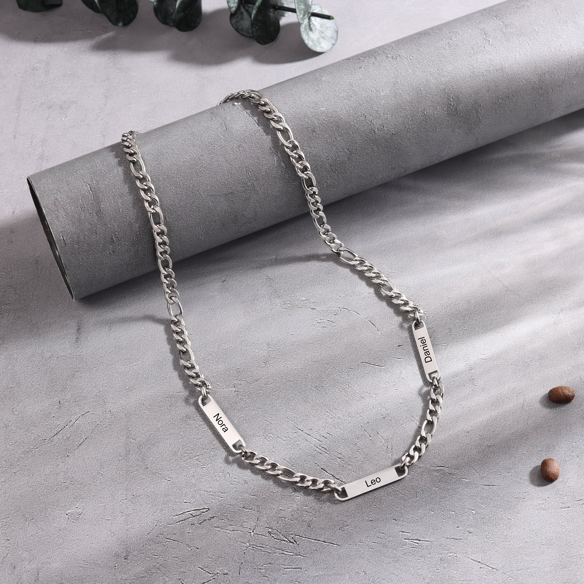 This durable necklace comes with a classic Figaro chain and is available in your choice of silver or gold finishes. The water-resistant materials ensure it remains pristine even with everyday wear. With three customizable font options, you can tailor the engraving to perfectly match the recipient’s personal style, making this a truly unforgettable gift for birthdays, Father’s Day, or any special occasion.